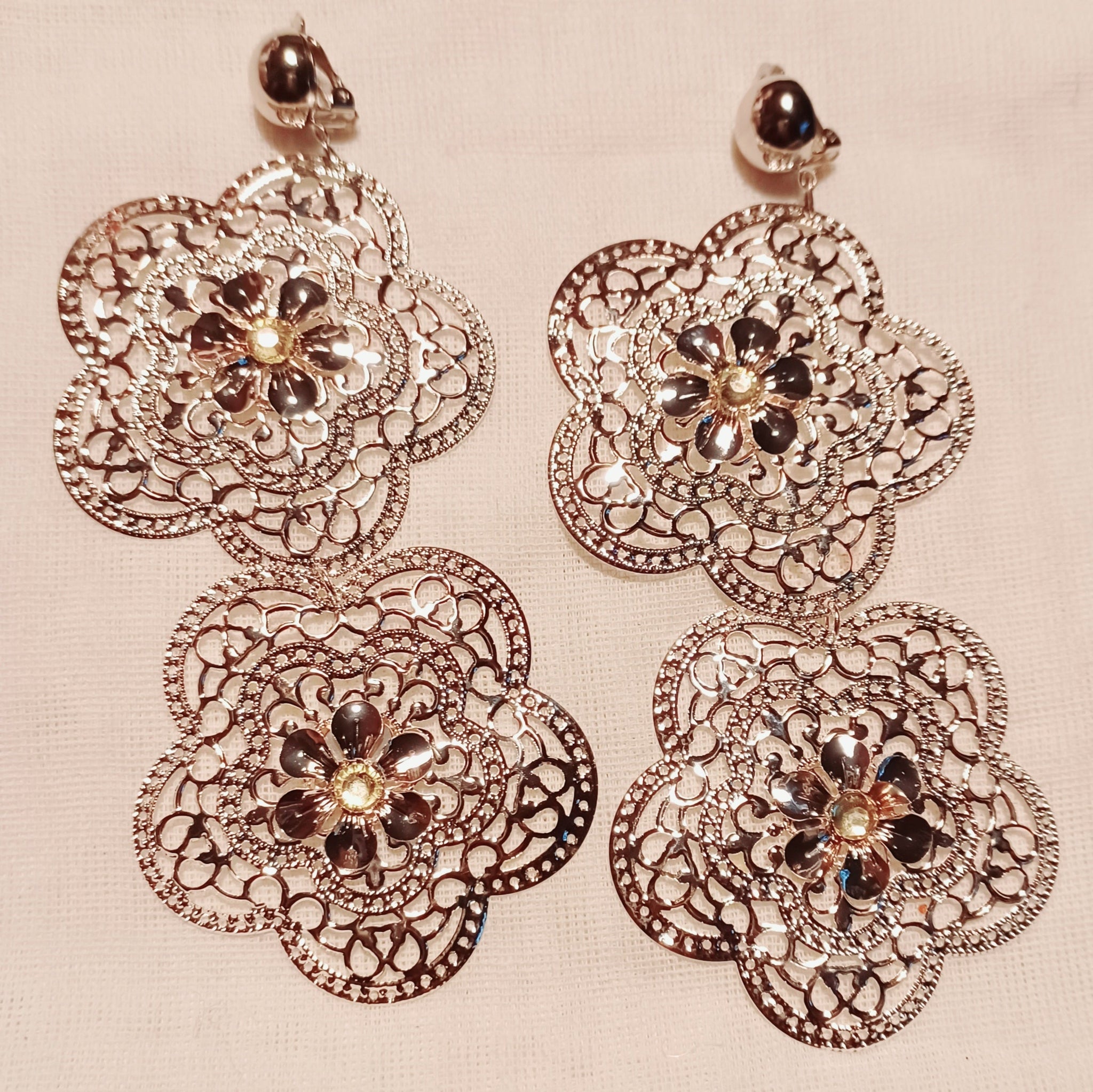 So blingy and artsy These handmade metal flower clip Earrings.... Hang 4.5 inches These are large and are very lightweight Silver tone metal One of a kind Earrings