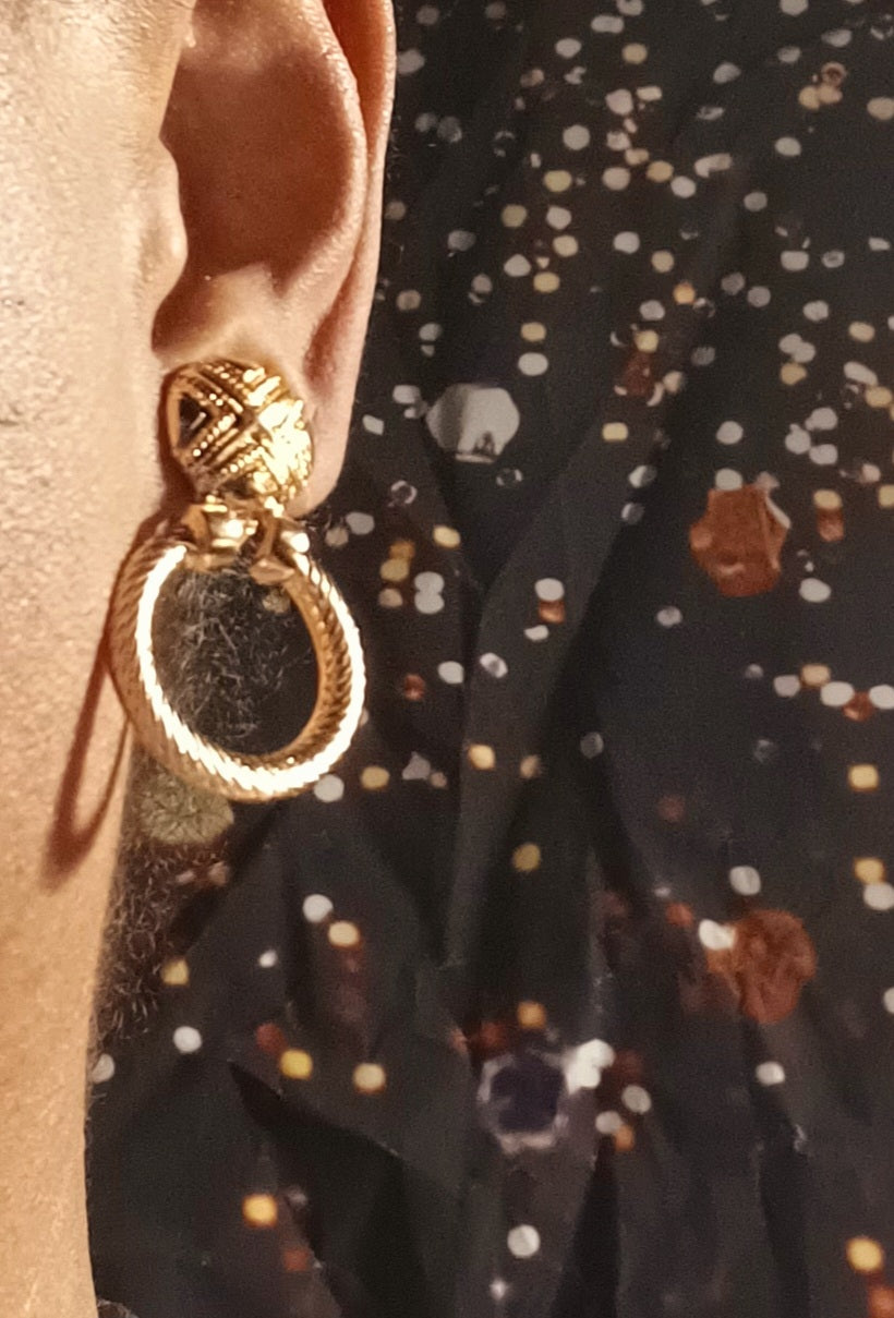 Very unique and attractive designChunky handmade Metal gold hoops Gold metal colorSmall medium styleSuper light and thin metalThese hang 2 inches Very light on the ear Sturdy metal clip on closure