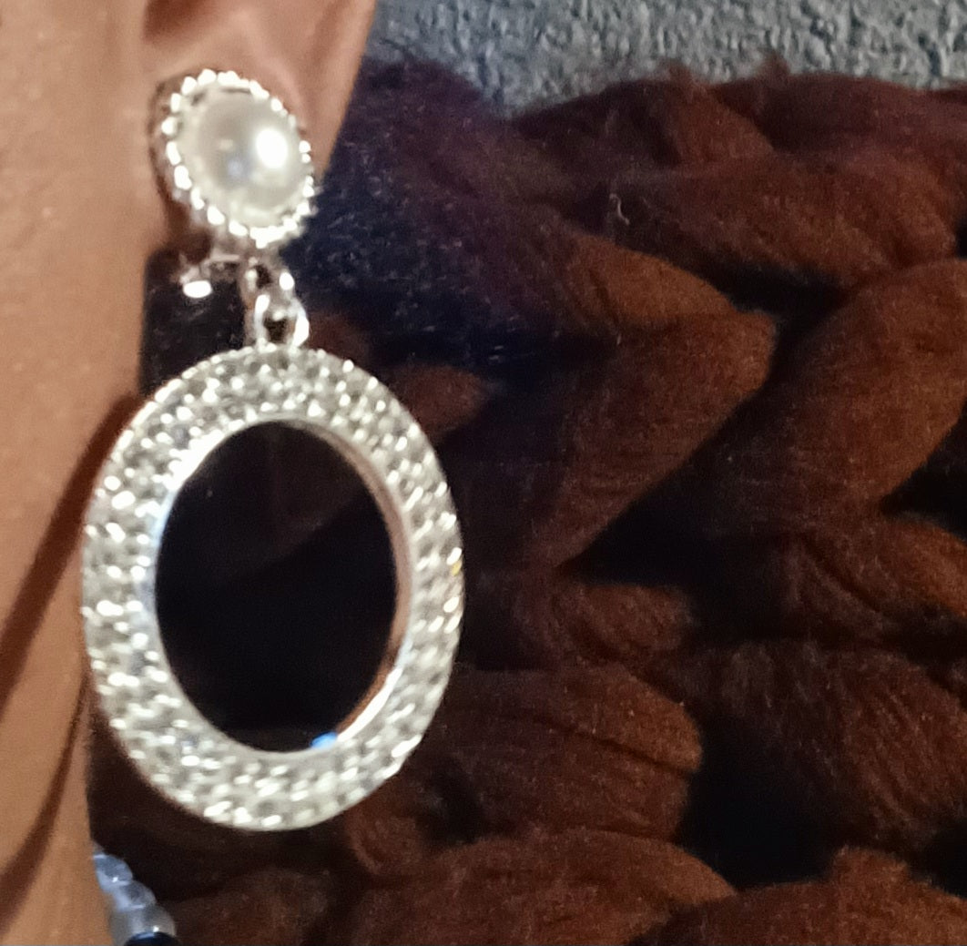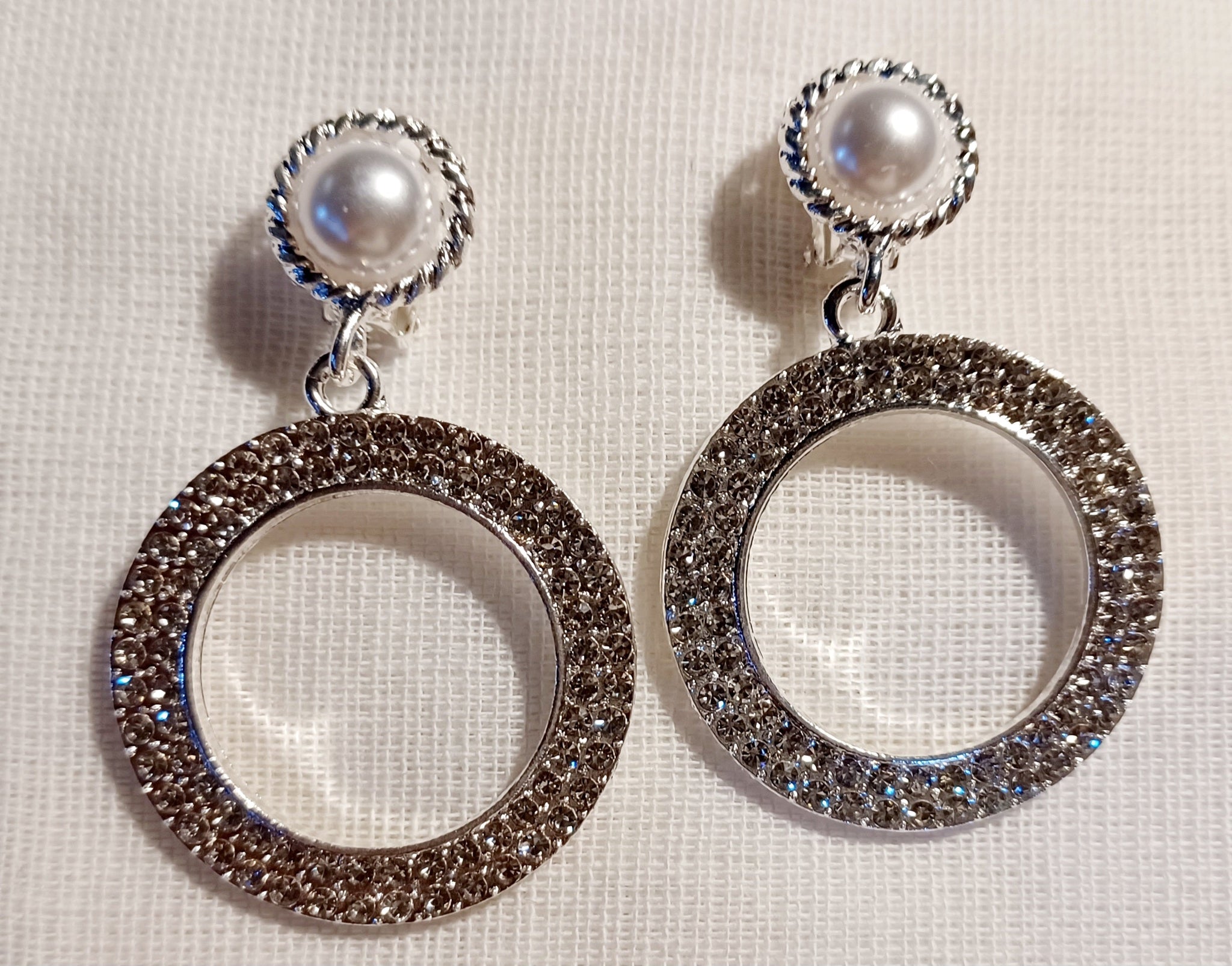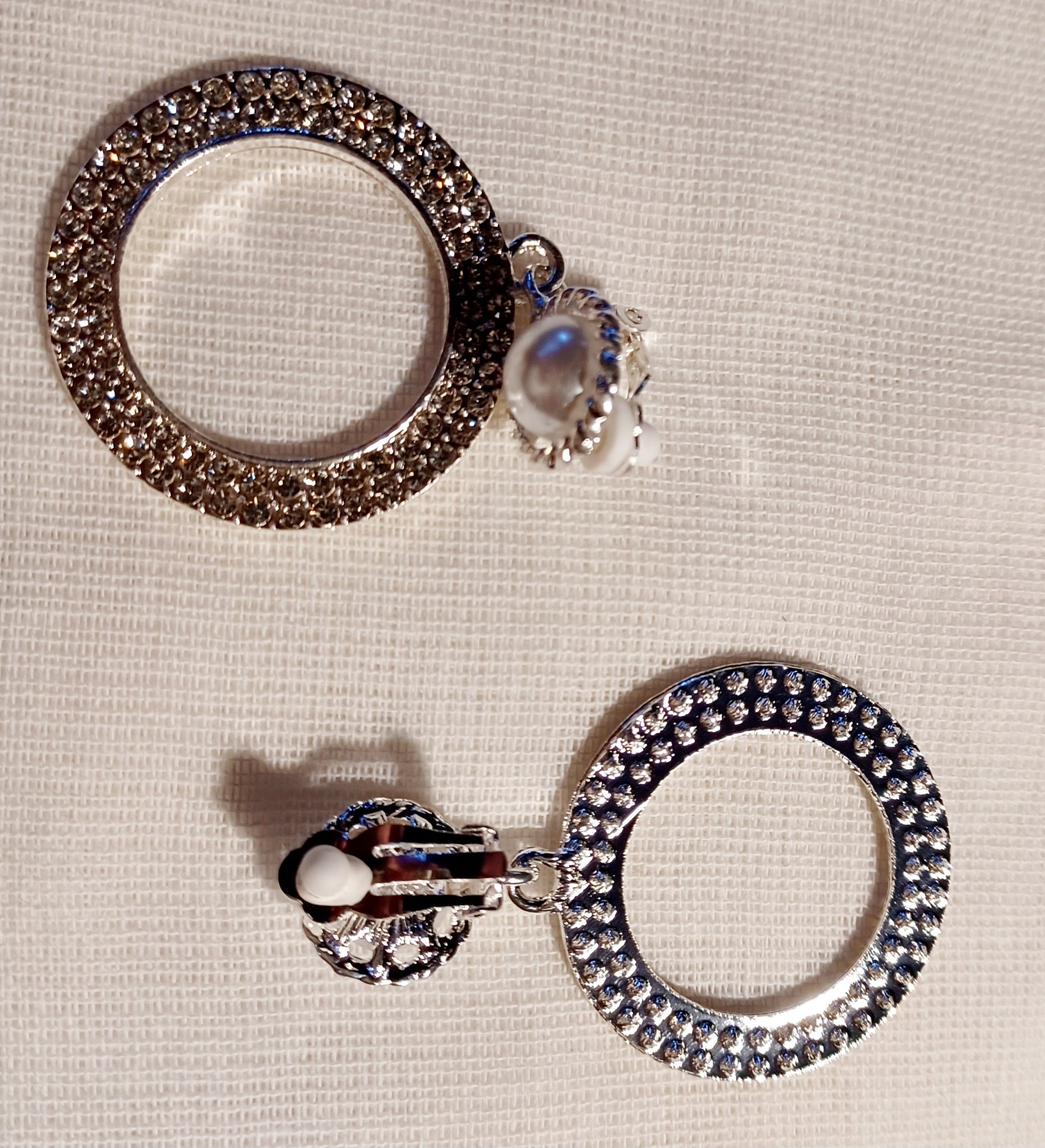 Blingy style silver metal These hang 2.5 inches very light Blingy rhinestones faux pearl clip on These are very lightweight on the ear Easy to wear Statement style They are one of a kind These Earrings are a classic and timeless addition to any wardrobe