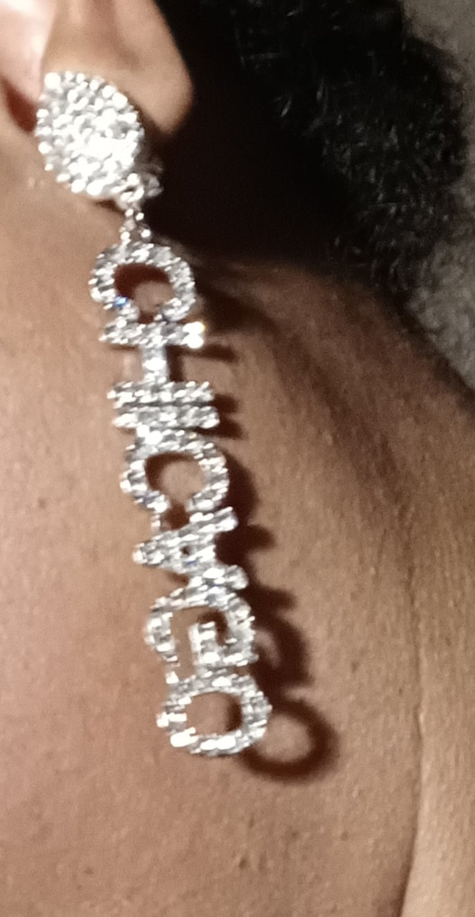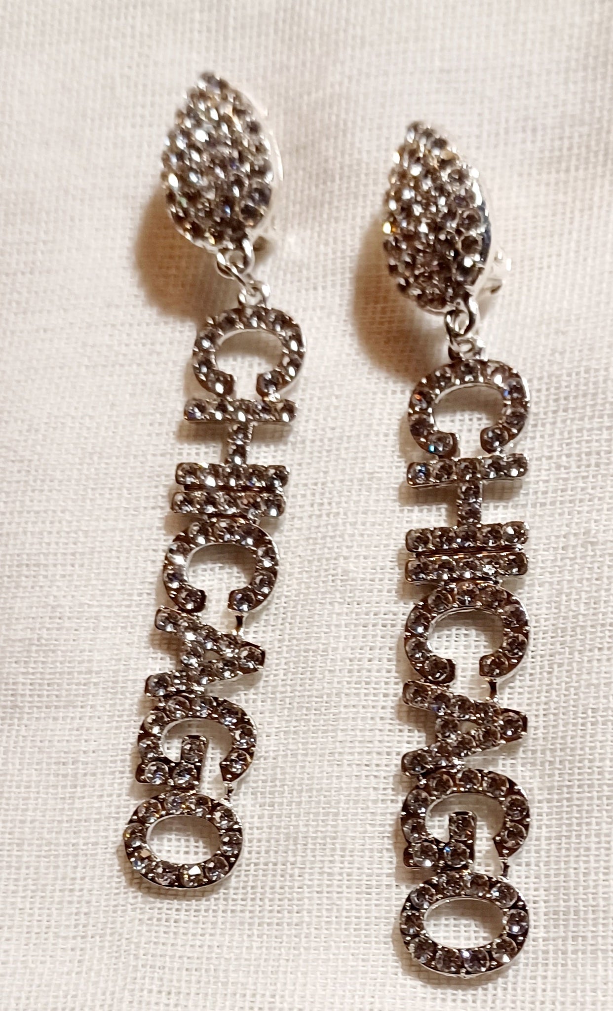 Very unique blingy and attractive designMedium sized sized gold rhinestone Chicago statement clip on EarringsSuper light designThese hang 3 inches Very light on the ear Sturdy metal clip on closure Handmade originals