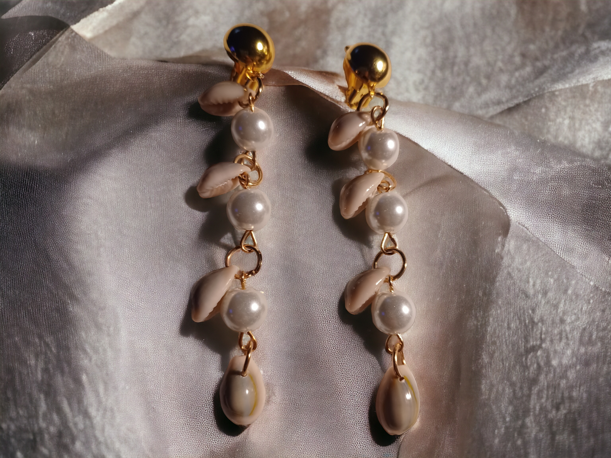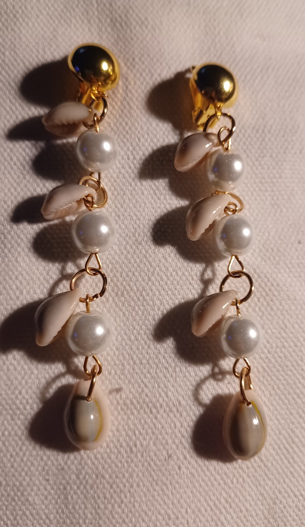 • Load image into Gallery viewer, Faux pearl and cowrie shell dangle clip on earrings