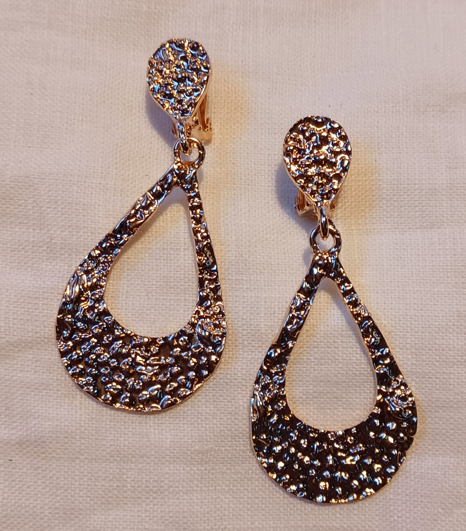 Gold Hammered Hoop Clip on Earrings 2 inch