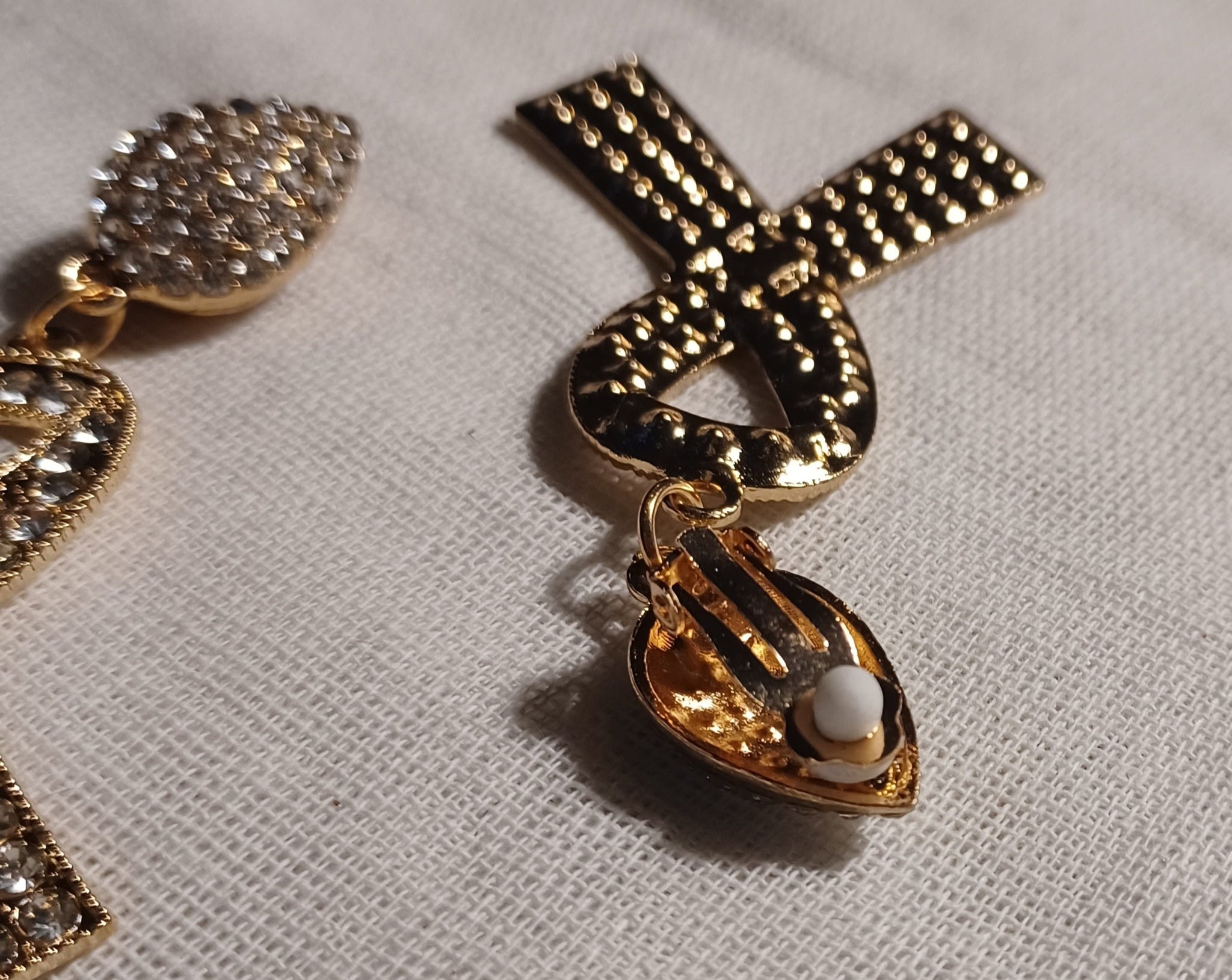Beautiful styleThe earrings hang 3 inchesLarge size Secure clip on closureHandmade originals Gold with rhinestone Rhinestone clip on closureVery unique sure to get compliments Can be worn for any awareness statement