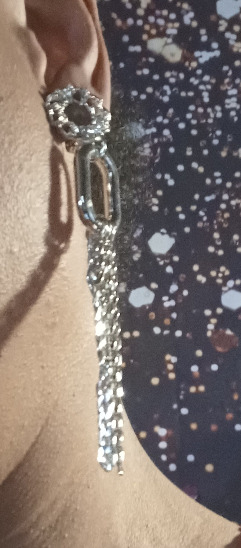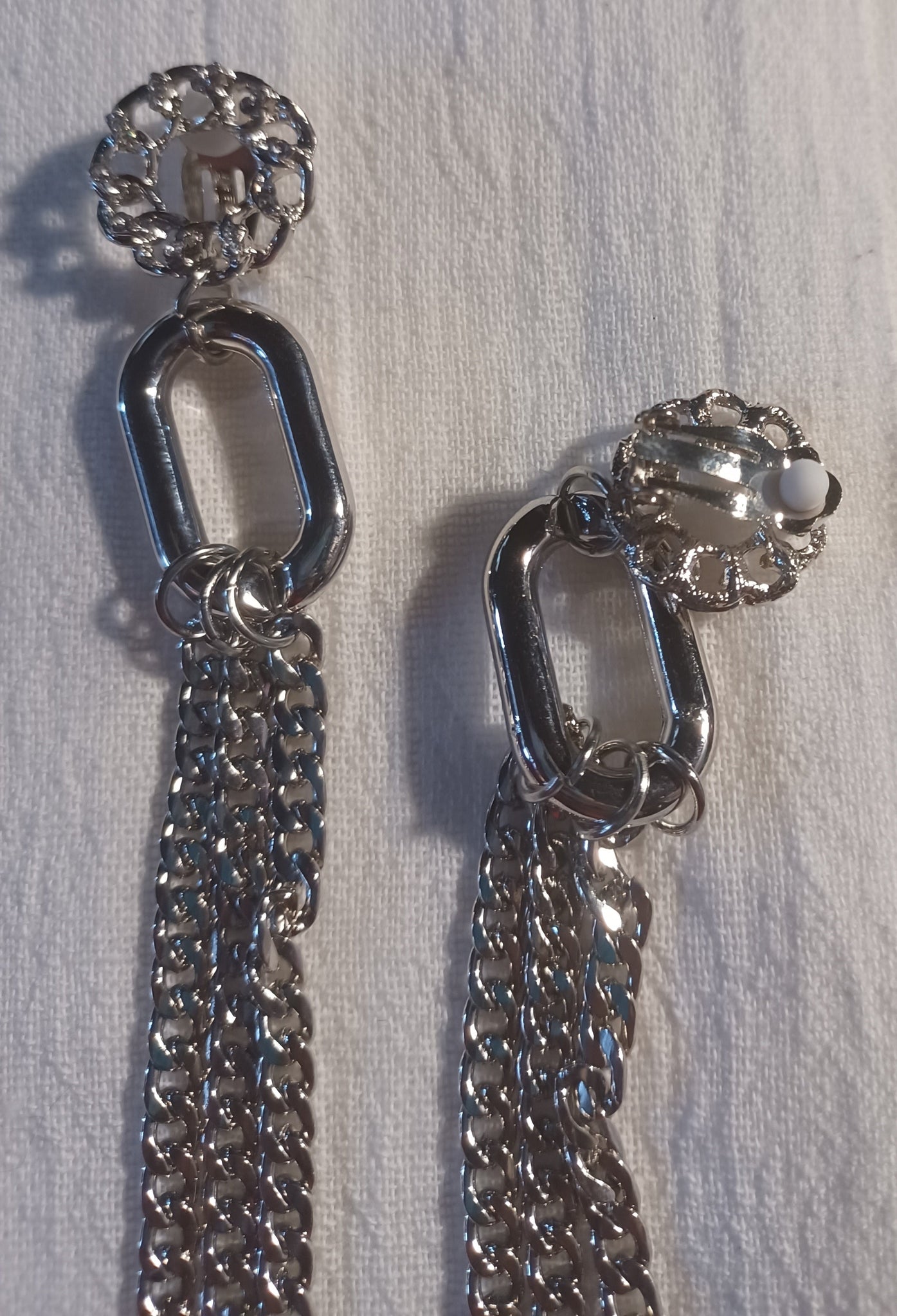 Very unique styleHandmade and original designong Metal Chain designVery light on the ear These hang 3.5 inchesSturdy and blingy rhinestone clip on closure All silver metal
