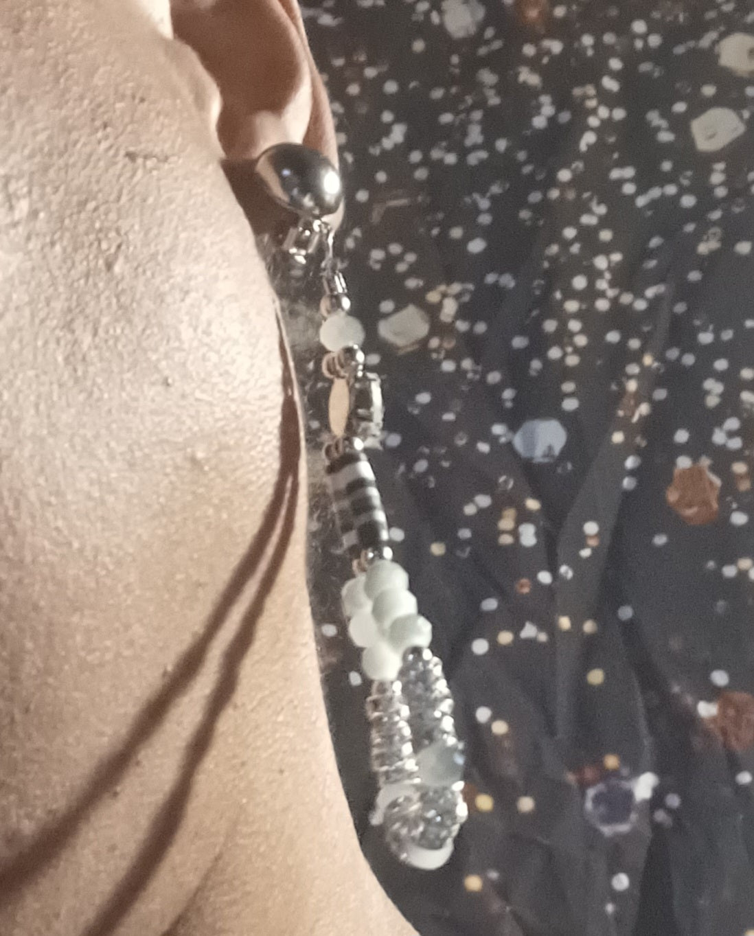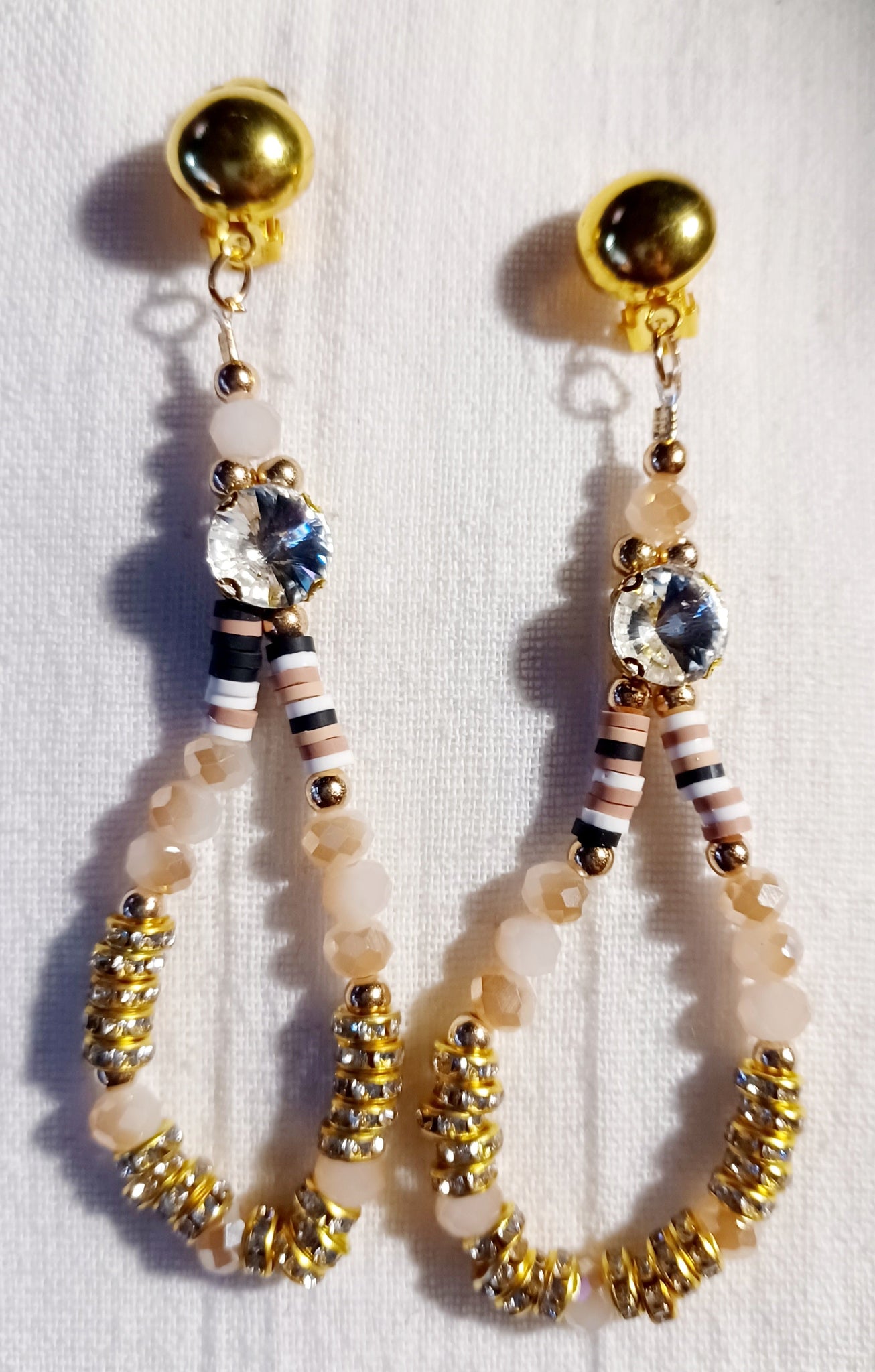 Super light and thin metal rhinestone and acrylic beads These hang 3 inches Very light on the ear Sturdy metal clip on closure